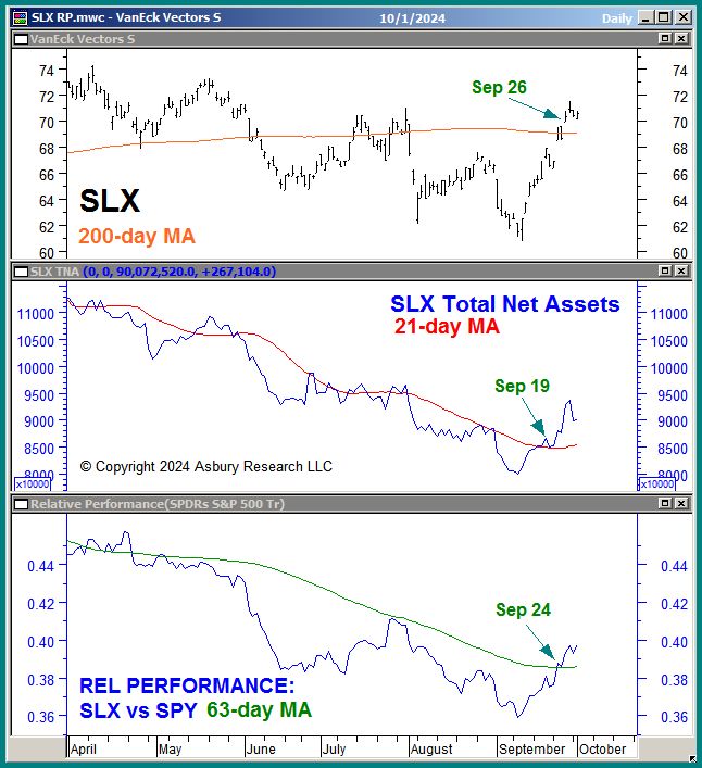 The VanEck Steel ETF (SLX) is in a September 26th emerging major uptrend, according to its position above its 200-day moving average, amid expanding investor assets and relative outperformance versus the S&P 500 (SPY).  Together, these factors establish favorable conditions for more outright strength and relative outperformance from SLX and other steel related assets.