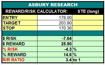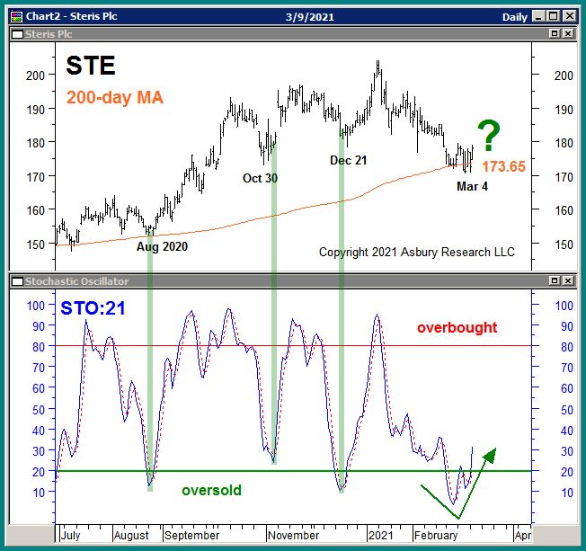 The rightmost green highlights in Chart 1 below show that STE testing major underlying support at its 200-day moving average, currently at $173.65 while reversing from monthly (our Tactical time period) oversold extremes. The other green highlights show that previous instances of this, in December, October, and August 2020, helped trigger the resumption of the stock’s May 2020 major uptrend as defined by the 200-day MA. This sets up a low-risk buying opportunity because, If that major uptrend is still valid, this is where it should resume.