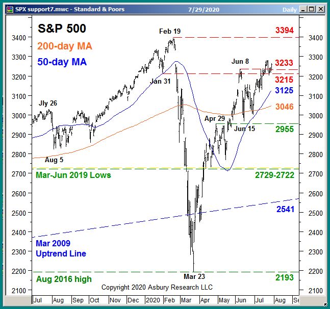 In our previous July 16th Stock Market Update & Asbury Investment Management Video, we pointed out that the benchmark S&P 500 (SPX) had risen from a June test of major underlying support and was testing primary overhead resistance at 3215 to 3233. Chart 2 below, an updated version of the one from that July 17th update, shows that SPX continues to test 3215 to 3233 resistance and is apparently having some trouble getting through it.