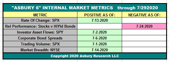 The dates in each cell indicate when each individual constituent of the A6 turned either positive (green) or negative (red). When all Asbury 6 are positive, market internals are the most conducive to adding risk to portfolios. Each negative reading adds an additional element of risk to participating in current or new investment ideas.
