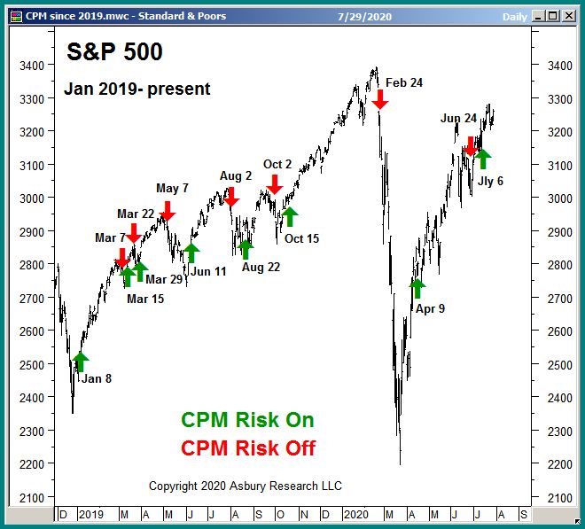 Our other Tactical model, the Correction Protection Model (CPM), has been on a Risk On status (adding risk to portfolios) since July 6th. Chart 1 below highlights CPM’s Risk On and Risk Off signals since 2019.