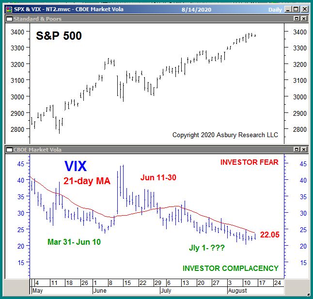 As long as the VIX remains below its 21-day MA, currently at 22.05, we will view market volatility as being conducive to more near term US stock market strength. A sustained rise above there, however, would indicate the market is becoming apprehensive and would warn of an emerging market decline.