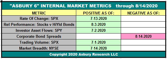 The table below displays the current reading of the Asbury 6, which uses six different metrics to determine the daily internal strength of the US stock market. The “A6” is currently on a Positive status and has been since July 2nd. The benchmark S&P 500 has risen by 243 points or 8% since then.