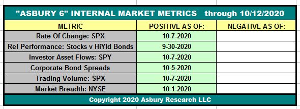 Editor’s Note: The Asbury 6 is a combination of six diverse market metrics that we use as a lie detector test for the market — to help identify real, sustainable market advances or declines from computer-driven traps for investors. It is updated daily in our Research Center. We created the Asbury 6 primarily because algorithmic trading now accounts for about 80% of the daily volume in the US stock market. Many of these computer-generated trading programs are designed to prey on human investors by causing quick, sharp moves in financial asset prices that provoke people to make emotionally driven, ill-timed trading decisions to enter or exit the market at the worst possible times and places. The Asbury 6 is designed to look past the day-to-day noise of the market to determine its real “under-the-hood” condition.