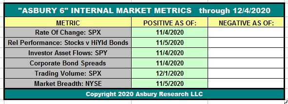 In our previous Nov 20th Stock Market Update & Asbury Investment Management Video, entitled Happy Holidays For Investors? Watch The Market’s Vital Signs, we pointed out that our Asbury 6 risk management model turned back to a Positive (bullish) status on Nov 4th. We said that as long as that Positive status remained intact, the US stock market was likely to continue moving higher over the near term — despite its incredible 68.8% rise from the Mar 23rd lows.