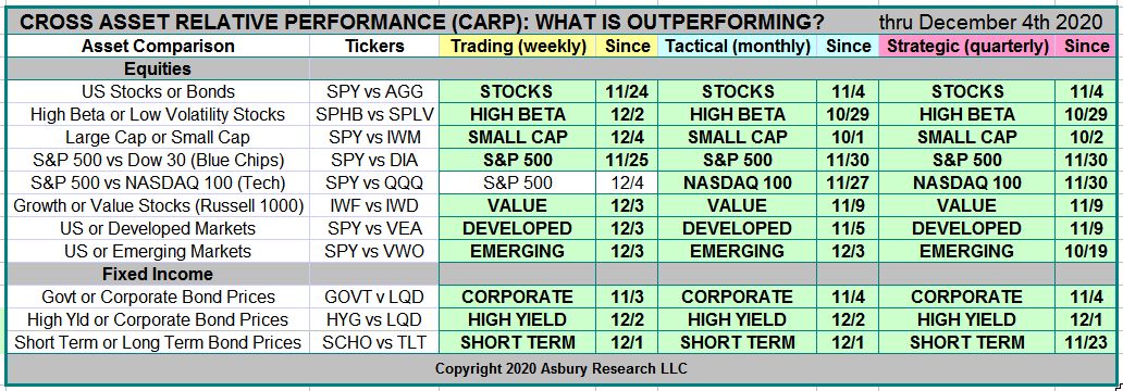 The Asbury 6 indicates when to be invested. Another one of our in-house quantitative models, the Cross-Asset Relative Performance (CARP) Model, indicates where to be invested. A newly-updated version of the CARP Model appears below.