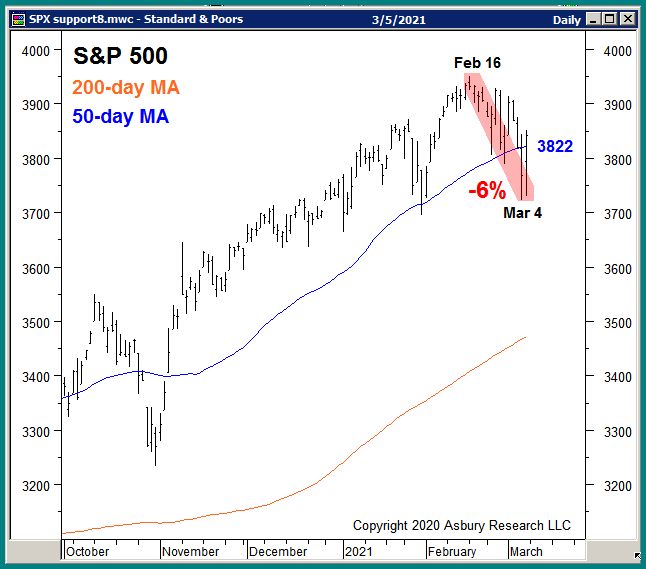 Chart 1 below shows that SPX actually peaked 5 days before that report, on February 16th, and subsequently collapsed by 227 points or 6% into Thursdays (Mar 4th) low. This decline actually broke the 50-day moving average (blue line), a widely-watched minor trend proxy, which warns of an emerging corrective decline.