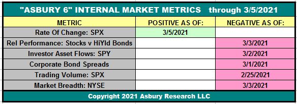 Meanwhile, our Asbury 6, one of two in-house Tactical models we use to indicate when to be invested, turned Negative on March 3rd. The “A6”, shown below through March 5th, is is an objective, data-driven daily assessment of the internal health of the US stock market.