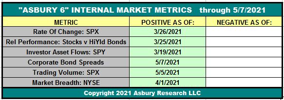 How To Interpret The A6: Four or more metrics in one direction, either Positive (green) or Negative (red), indicate a Tactical bias. The dates in each cell indicate when each individual constituent of the A6 turned either positive (green) or negative (red). When all Asbury 6 are positive, market internals are the most conducive to adding risk to portfolios. Each negative reading adds an additional element of risk to participating in current or new investment ideas.