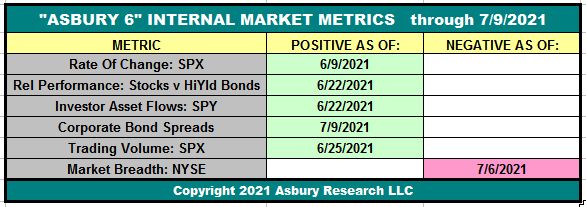 How To Interpret The Asbury 6: The “A6” is updated daily in our Research Center. Four or more metrics in one direction, either Positive (green) or Negative (red), indicate a Tactical bias. The dates in each cell indicate when each individual constituent of the A6 turned either positive (green) or negative (red). When all Asbury 6 are positive, market internals are the most conducive to adding risk to portfolios. Each negative reading adds an additional element of risk to participating in current or new investment ideas.