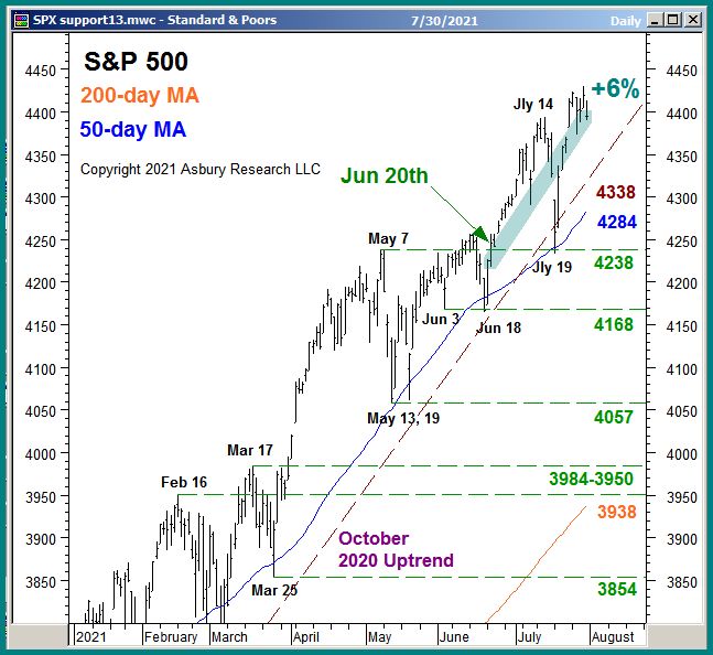 The green highlights in Chart 1 below, which plots the S&P 500 daily since January, show that the index has risen by 6% since our Jun 20th update — and that its November 2020 Tactical uptrend still remains intact.