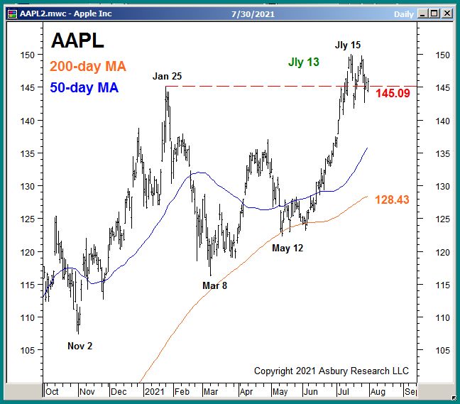 The chart shows that AAPL broke out to new all-time highs on Jly 13th, but has been struggling to remain above the previous $145.09 Jan 25th high ever since. AAPL finished last week just slightly above it at $145.86. If AAPL fails to remain above $145.09 it will indicate that the US broad market is losing a big chunk of its remaining leadership — and we would see this as a potential leading indicator that a broad market correction is emerging.