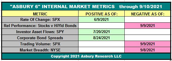 The table below shows that, through Friday September 10th, three of the Asbury 6 constituent metrics are positive (green). The “A6” model itself has been on a Positive status since July 20th. The S&P 500 has risen by as much as 5.2% since then.