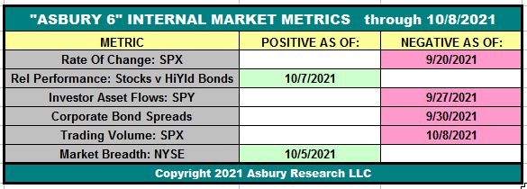 In our previous September 26th market update, entitled Emerging Correction Or Just A Bump In The Road? Here Are 2 Ways To Tell., we said that our Asbury 6 risk management model had been on a Negative status since September 14th — and that this indicated the US stock market was in a corrective (bearish) phase. Through Friday, Table 1 below shows that the “A6” is still Negative as five of its six constituent metrics are bearish (red).