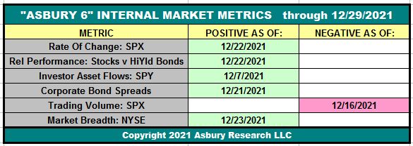 Meanwhile, the table below shows that the Asbury 6, our own daily risk management model, is currently Positive or bullish. Our model actually shifted back to a Positive status on Dec 22nd, two days after the second successful test of underlying support on Dec 20th. The S&P 500 has risen by an additional 5.4% since then.