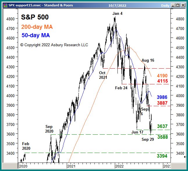 In our previous September 25th Stock Market Update & Asbury Investment Management Video, we pointed out that the benchmark S&P 500 (SPX) was testing major underlying support at 3637 to 3588. Two weeks later, Chart 1 below shows that this support is still being tested. This indicates the market not only “sees” this level but also recognizes its importance.