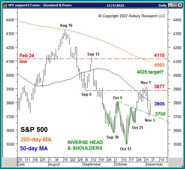 If the 3700 area holds as support and SPX rallies above 3877, it would confirm an important bottom at the October lows and target an upcoming rise to 4025. If 3700 does not hold and the Asbury 6 turns negative, however, it would indicate the larger 2022 decline is resuming and warn of upcoming new lows for the year.