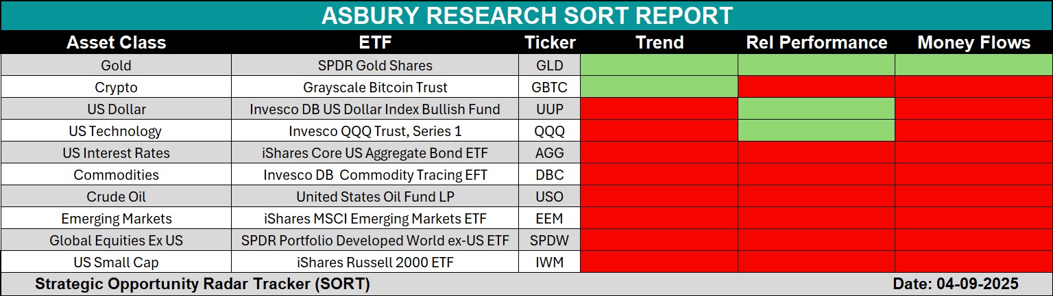The Strategic Opportunity Radar Tracker (SORT) is Asbury Research’s newest tool for helping investors identify high-confidence market opportunities with clarity and precision. Originally developed for internal use, SORT analyzes a basket of 10 ETFs across Bonds, Commodities, Emerging Markets, Technology, and Broad Market Indexes using three core metrics—price trend, relative performance, and money flows.