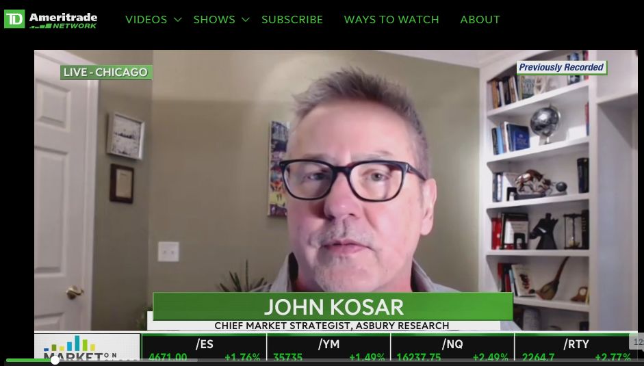 John Kosar, CMT, our Chief Investment Strategist, appeared Tuesday, December 7th on the TD Ameritrade Network‘s Market On Close show to discuss Asbury Research’s latest outlook for the US stock market.  John discusses the this week’s huge stock market rally, and what he believes is necessary for it to “stick” and bring us a Santa Claus Rally.