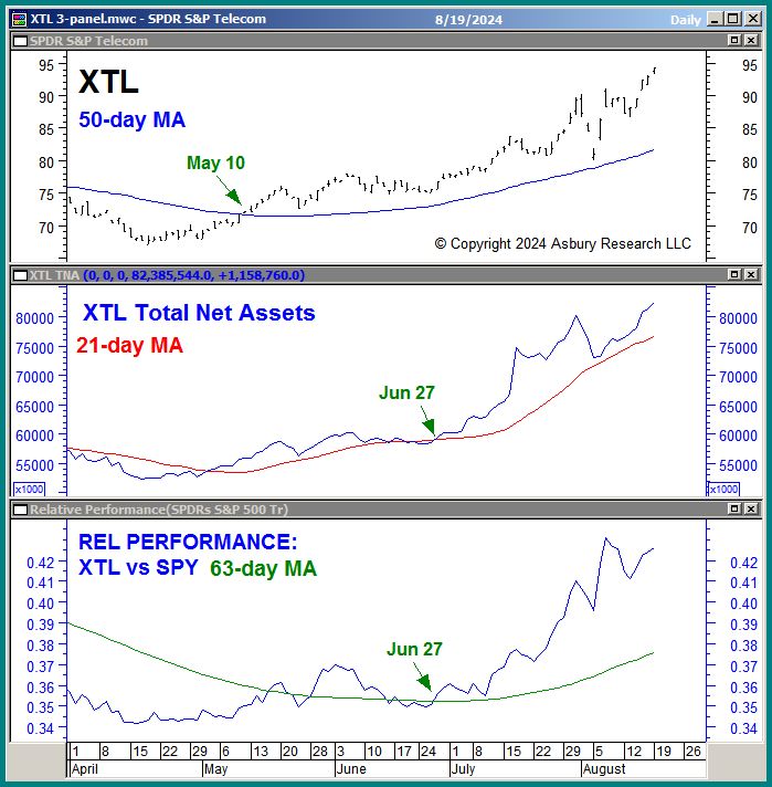 The upper panel of Chart 1 below shows that the SPDR S&P Telecom ETF (XTL) is in the midst of a May 10th major uptrend as defined by its 200-day moving average. Not shown is that over the past two sessions, XTL has broken a major overhead resistance level at its 91.88 August 2022 benchmark high. The middle panel shows that the total net assets invested in XTL (AUM) are in the midst of a Jun 27th trend of monthly expansion. Expanding assets indicate bullish conviction. The lower panel shows that XTL has been outperforming the benchmark S&P 500 (SPX) on a Strategic quarterly basis also since Jly 27th.