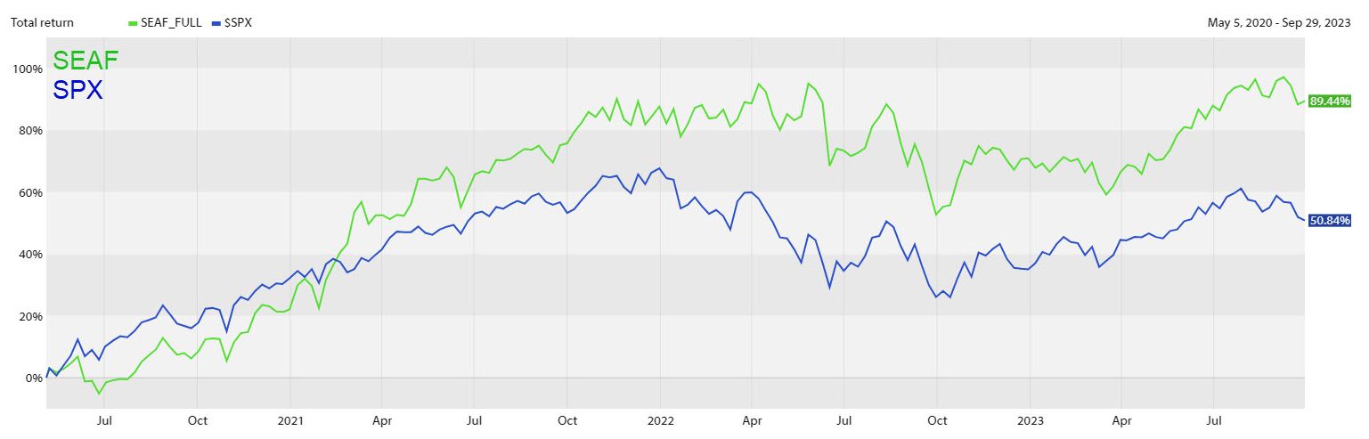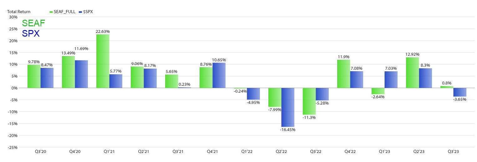 The bottom part of the table shows that SEAF outperformed the S&P 500 (SPY) by 21.3% during the 2021 bull market, outperformed SPY by 12.0% during the 2022 bear market, and has outperformed SPY by 35.9% throughout the entire period beginning Q3 2020.