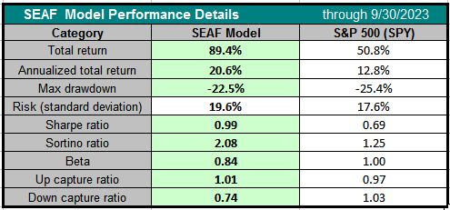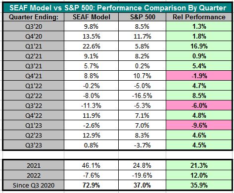 The first table below displays the quarter-by-quarter relative performance of the SEAF Model vs. the S&P 500, showing that SEAF has outperformed the S&P 500 in 10 of the past 13 quarters (77%) tested through September 2023.