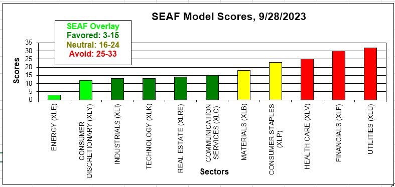 The Ranking column in the SEAF Model Graphic above sorts the entire table of 11 sector ETFs according to the sum of rankings in the Trading, Tactical, and Strategic categories, from largest inflows to largest outflows. The SEAF Model Scores chart below displays this ranking according to Favored (score of 1-15, green), Neutral (score of 16-24, yellow), and Avoid (score of 25-33, red) sectors. On this chart, the actual SEAF Model Overlay signals, which include a money management component, are highlighted in a brighter shade of green.