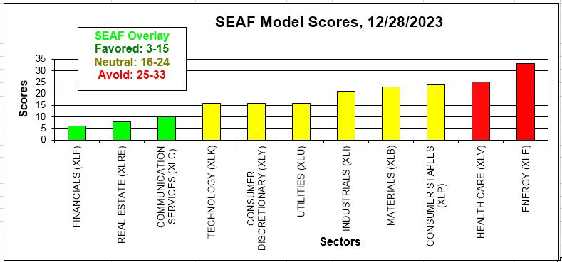 The Ranking column in the SEAF Model Graphic above sorts the entire table of 11 sector ETFs according to the sum of rankings in the Trading, Tactical, and Strategic categories, from largest inflows to largest outflows. The SEAF Model Scores chart below displays this ranking according to Favored (score of 1-15, green), Neutral (score of 16-24, yellow), and Avoid (score of 25-33, red) sectors.