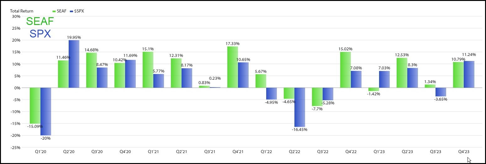 - SEAF has both a higher up capture ratio (gains in up markets) and lower down capture ratio (losses in down markets) than the S&P 500.