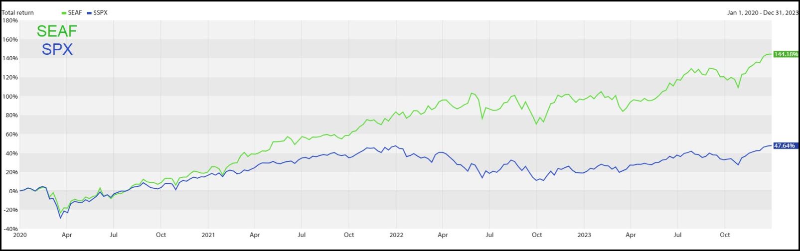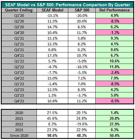 The first table below displays the quarter-by-quarter relative performance of the SEAF Model vs. the S&P 500, showing that SEAF has outperformed the S&P 500 in 11 of the past 16 quarters (69%) tested through December 2023.