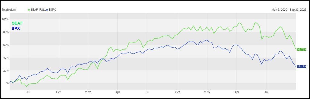 The bottom part of the table shows that SEAF has outperformed the S&P 500 by 7.2% for the first three quarters of 2022, and has outperformed the S&P 500 by 31.5% since Q3 2020.