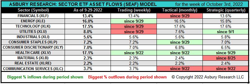 Through 3rd Quarter 2022 (through 09-30-2022), the Sector ETF Asset Flows (SEAF) Model is -19.53% year-to-date versus -26.68% for the S&P 500 (SPX), resulting in +7.2% of relative outperformance by SEAF.