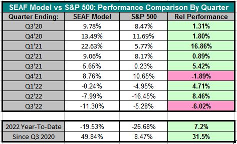 The first table below displays the quarter-by-quarter relative performance of the SEAF Model vs. the S&P 500, showing that SEAF has outperformed the S&P 500 in seven of the past nine quarters (78%) tested.