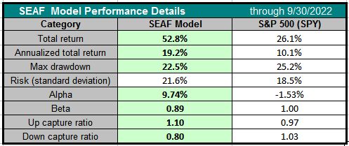 Bigger picture, SEAF has outperformed the S&P 500 in 7 of the past 9 quarters, is currently outperforming by 7.2% year-to-date, and has outperformed by 31.5% since Q3 2020 — all during a period that has included major uptrends and major downtrends. Moreover, since Q3 2020 the SEAF Model has outperformed the S&P 500 with 56% less risk according to Beta, with 5% less risk according to Standard Deviation, and with a 56% smaller Maximum Drawdown during that period.