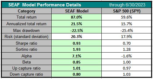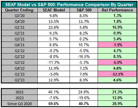 The first table below displays the quarter-by-quarter relative performance of the SEAF Model vs. the S&P 500, showing that SEAF has outperformed the S&P 500 in 9 of the past 12 quarters (75%) tested through June 2023. Not shown is that the SEAF Model has, on average during this period, outperformed the S&P 500 by 2.4% per quarter.