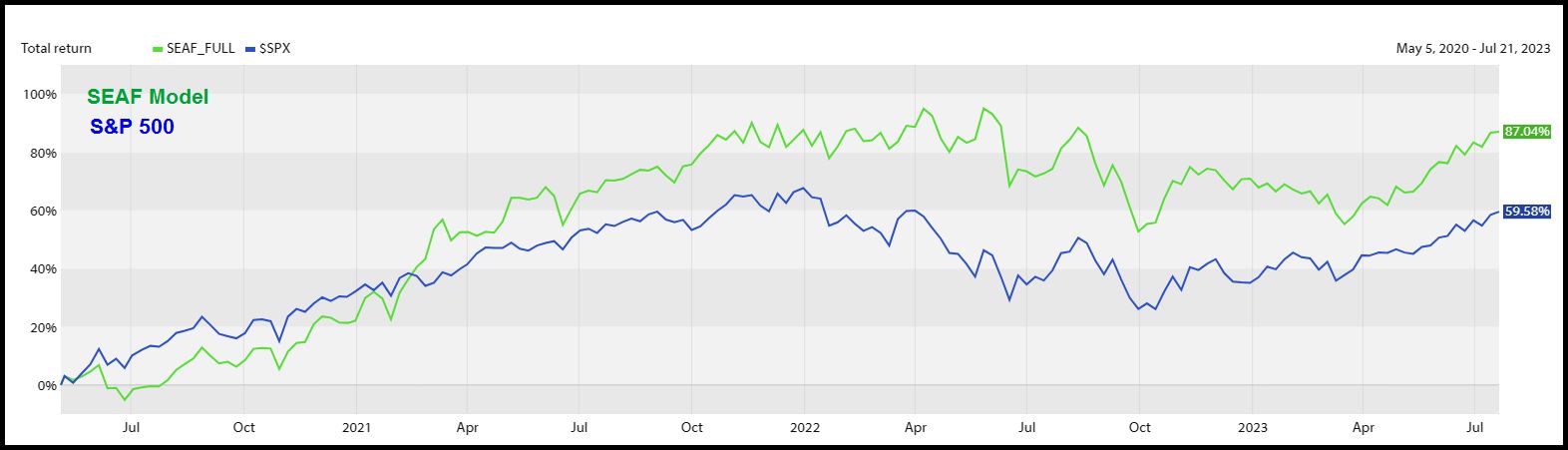 The chart below plots the daily performance of the SEAF Model vs. the S&P 500, in terms of percentage return, since May 2020.
