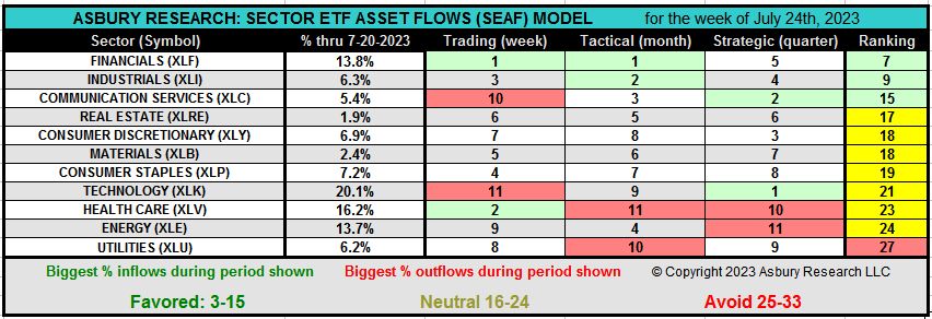 In the SEAF Model Graphic below, the 11 Sector SPDR ETFs are ranked weekly based on the velocity of investor assets moving into and out of them in three different time frames: Trading (one business week), Tactical (one business month), and Strategic (one business quarter). The sum of each sector’s individual scores across all three time frames determines their Ranking score, which are then categorized as Favored (score of 1-15, green), Neutral (score of 16-24, yellow), or Avoid (score of 25-33, red).