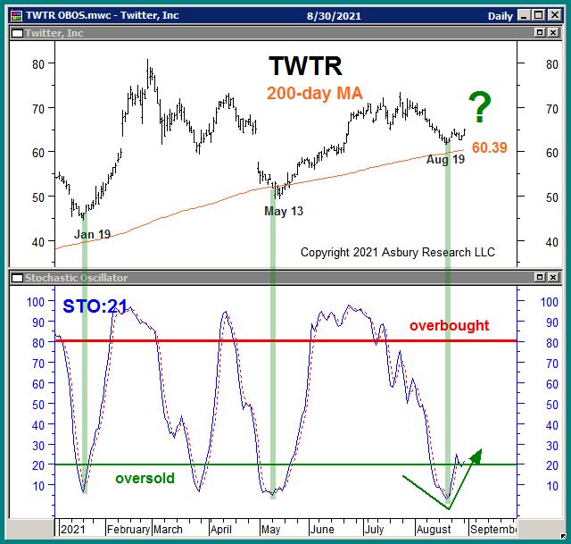 The rightmost green highlights in Chart 1 below show that TWTR is currently rebounding from an Aug 19th test of its 200-day moving average, a widely-watched major trend proxy currently situated at $60.39 (upper panel) while also rebounding from monthly (our Tactical time period) oversold extremes (lower panel). The other green highlights show that similar oversold extremes closely coincided with Tactical bottoms on May 13th and Jan 19th. These conditions set up a low-risk opportunity to buy an uptrending stock in a potentially low-risk/high reward environment, just above major support.