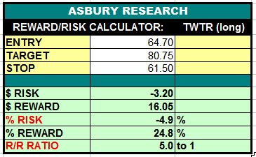 Twitter, Inc. (TWTR) is amid favorable conditions to resume its July 2020 Strategic advance from major underlying support near $60.39, which is currently being tested. A sustained rise above this area would target an additional 25% rise to $80.75 per share. This is an Asbury Value trade idea.