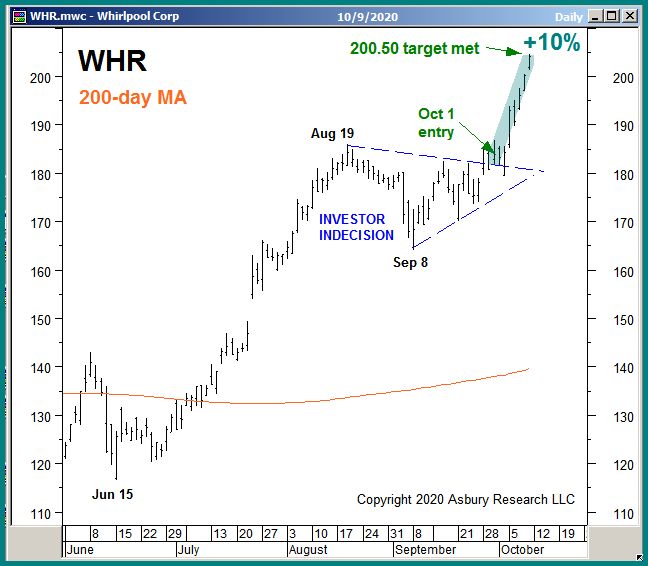 Whirlpool Corporation (WHR) met our $200.50 upside target today, which was first mentioned in our Oct 1st Asbury Alert entitled Whirlpool (WHR) Resuming June Advance, to capture an $18.53, 10.1% advance in just 7 trading sessions.