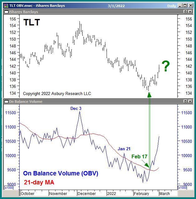 The green highlights show that OBV rose above its 21-day MA on Feb 17th to indicate a new monthly trend of rising urgency to buy TLT (which moves inversely to yields). That trend change in volume marked the bottom in the price of TLT. As long as it continues, long-dated USA Treasury prices should continue to rise as yields continue to decline into the 1.70% to 1.55% support window we identified above.