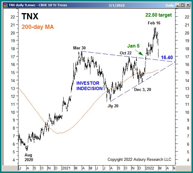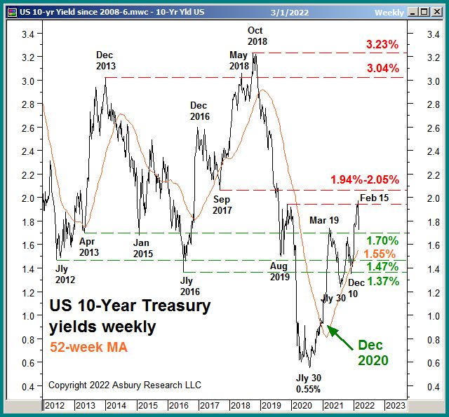 Chart 1 below plots a weekly, close-only chart of the yield of the 10-Year Treasury Note since 2012 along with its 52-week moving average, the latter a popular major trend proxy. The green arrow points out that these yields rose above their 52-week MA in December 2020 to indicate a major trend change toward rising long term US interest rates, and that this trend was subsequently tested and held on Jly 30th and Dec 10th.