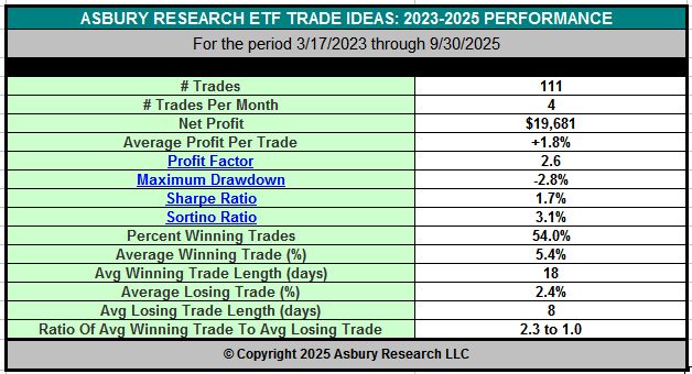 The table below breaks down the 109 individual trade ideas published in real time via our Asbury ETF Trade Ideas from March 17th, 2023, through September 30th, 2025, for a total of 2 1/2 years. Our Asbury ETF Trade Ideas are accessible directly from the Research Center.
