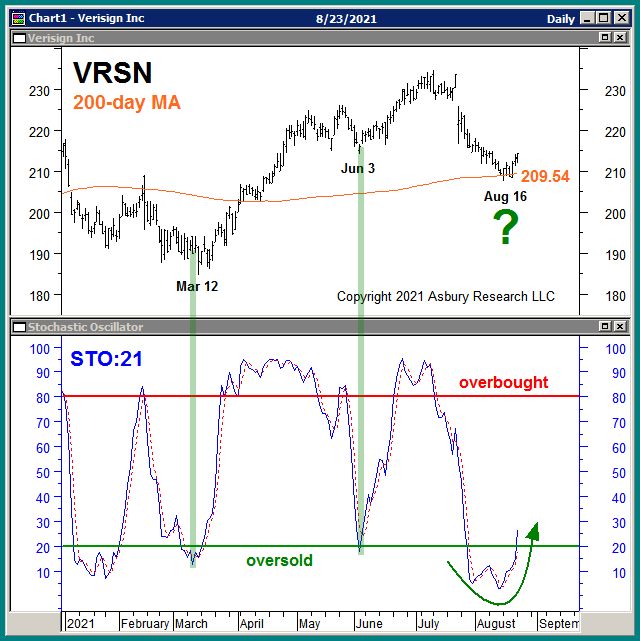 The rightmost green highlights in Chart 1 below show that VRSN is currently rebounding from an Aug 16th test of its 200-day moving average, a widely-watched major trend proxy currently situated at $209.54 (upper panel) while rebounding from monthly (our Tactical time period) oversold extremes (lower panel). The other green highlights show that similar oversold extremes closely coincided with Tactical bottoms on Jun 3rd and Mar 12th. These conditions set up a low-risk opportunity to buy an uptrending stock in a potentially low-risk/high reward environment just above major support.