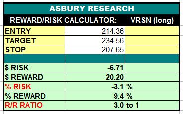 VeriSign, Inc. (VRSN) is amid favorable conditions to resume its April 2021 Strategic advance from major underlying support near $209.54, which is currently being tested. A sustained rise above this area would target an additional 9% rise to $234.56 per share. This is an Asbury Value trade idea.
