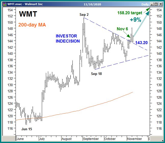 Chart 1 below plots WMT daily since June, highlighting its Nov 6th breakout higher from two months of sideways investor indecision. Despite current price volatility in many individual stocks, WMT has been able to sustain this breakout for the past three sessions. A sustained rise above the upper boundary of the indecision area, currently at $143.20, would confirm the breakout and target an additional 9% rise to $158.20 per share.