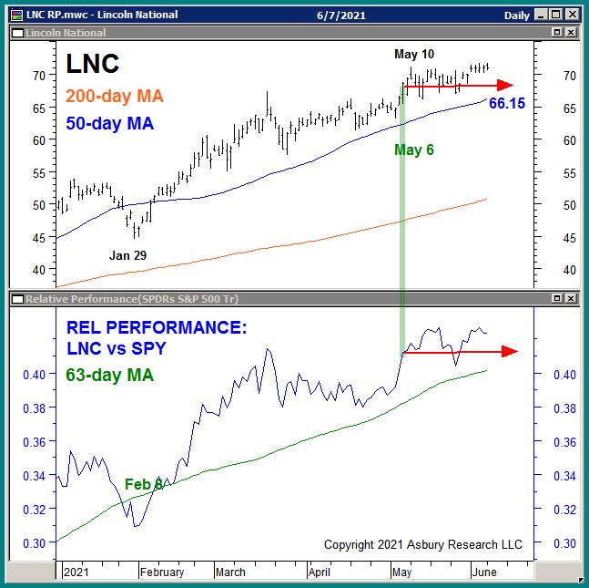 The chart below is an updated version of the one that appeared in our May 6th report.  Although LNC has managed to remain above $62,15, the stock has essentially been moving sideways since shortly after we published our buy idea, on both an outright and relative basis versus the S&P 500.  Most recently, the stock has been unable to set and hold fresh highs while internal momentum metrics have been weakening.