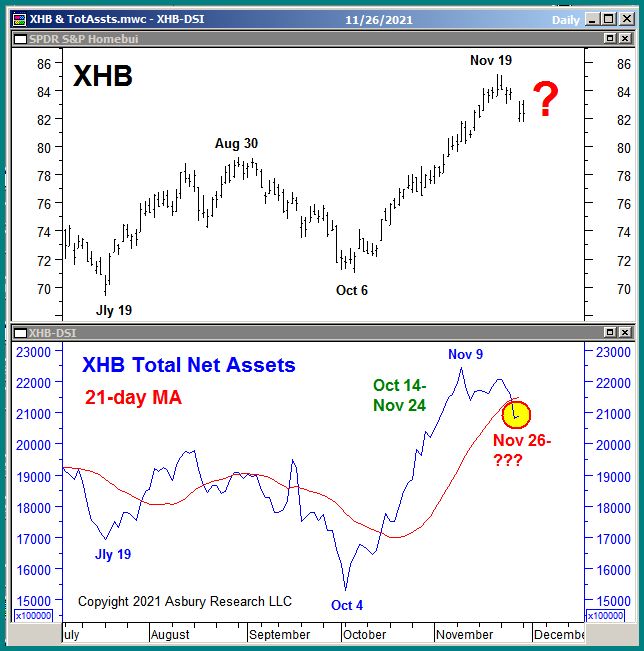 “(XHB’s) monthly trend of asset expansion is currently being tested.  As long as it remains intact, the current rise in XHB is likely to remain intact and to resume.  A new trend of monthly contraction in these assets, however, would suggest that a Tactical peak is in place at the Nov 19th high and that more weakness is likely.”