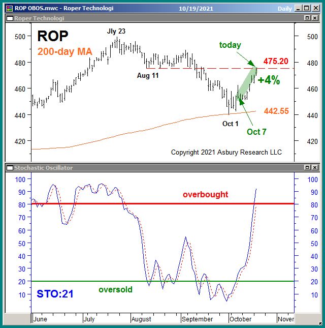 We exited our October 7th long idea in Roper Technologies, Inc. (ROP) this morning for a 4% outright gain while outperforming the benchmark S&P 500 by 2%.  We exited the idea because ROP is currently testing formidale overhed resistance at 475.20 just ahead of earnings for the fiscal Quarter ending Sep 2021 which is due for release before the open on Oct 22nd.