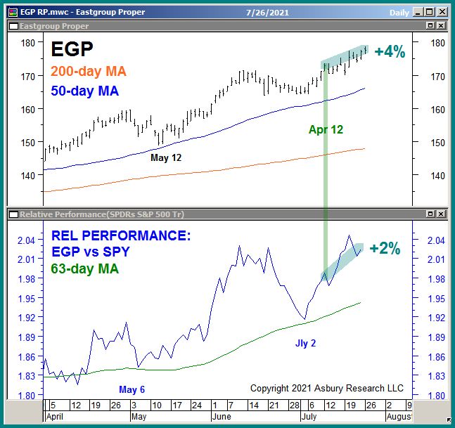 We exited our July 12th long idea in EastGroup Properties, Inc. (EGP) this morning for a 4% outright gain while outperforming the benchmark S&P 500 by 2%, ahead of the earnings report due to be released on 07/27/2021 after market close. The report will be for the fiscal Quarter ending Jun 2021.